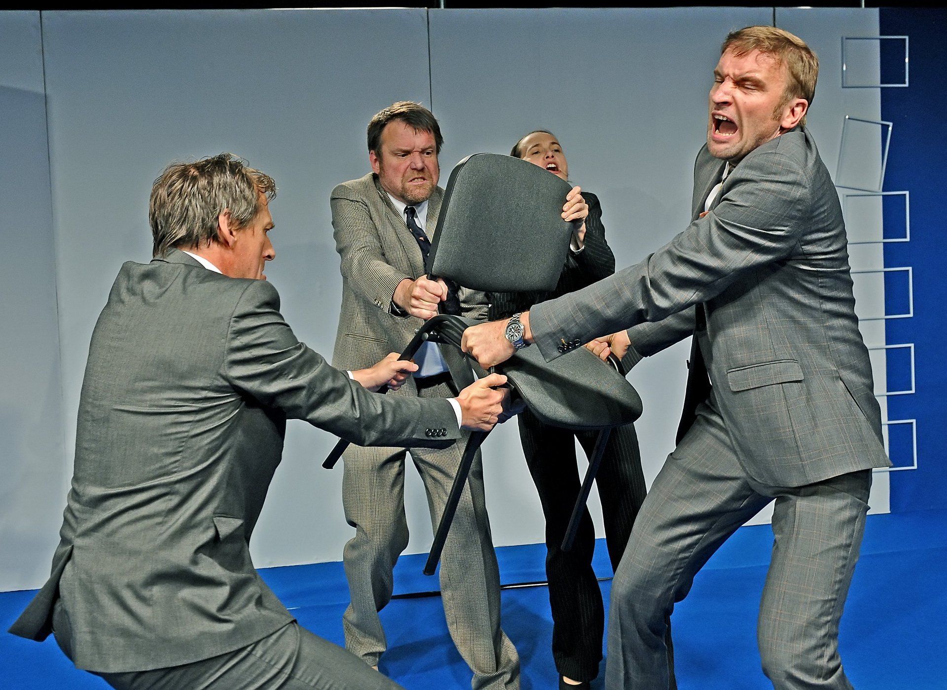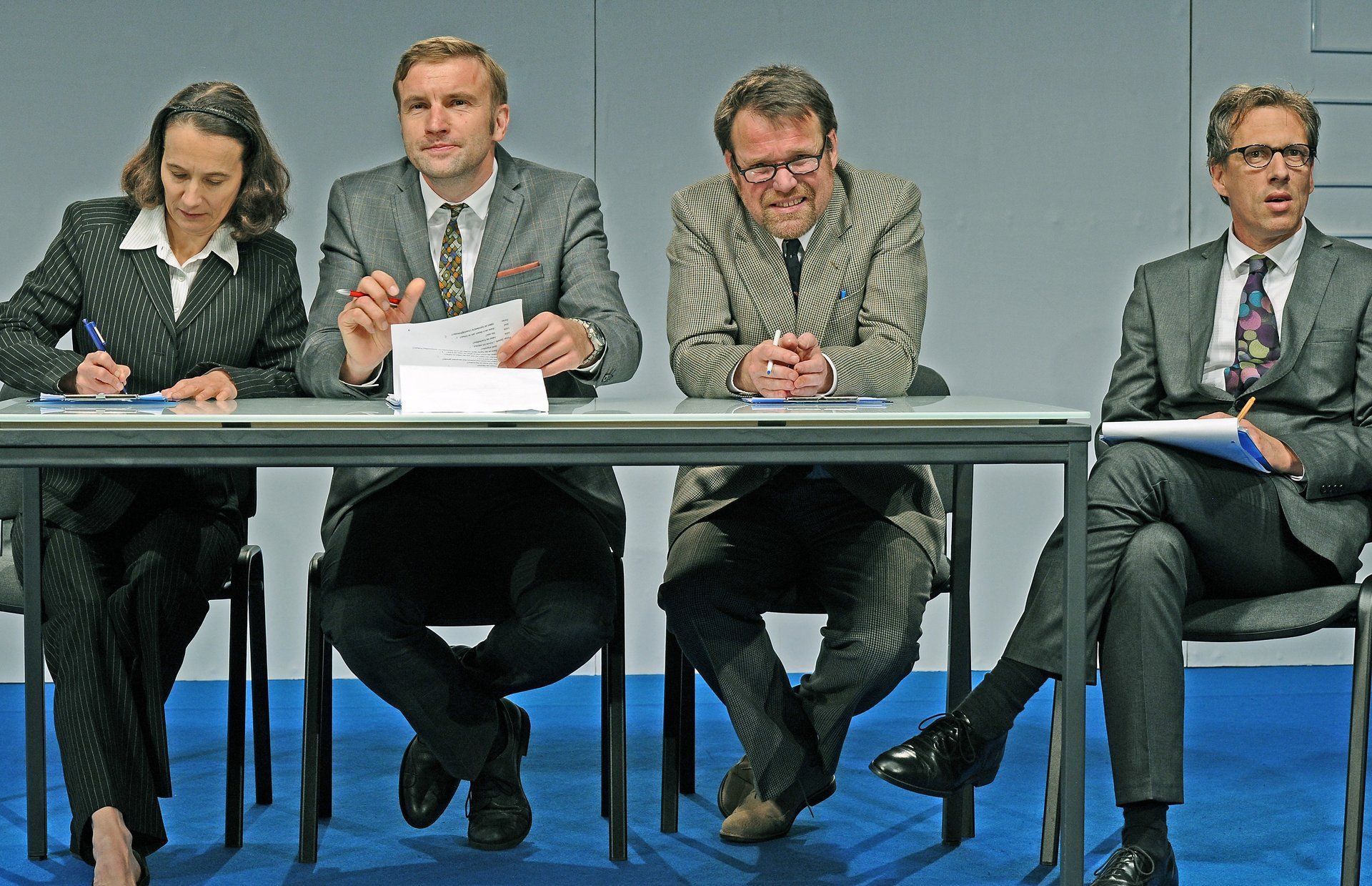 (...) Die vier Schauspieler werfen das Licht auch in Persönlichkeitsecken, in denen noch kein Therapeut gekehrt hat. Im Theaterhaus untersuchen sie eine Situation, die per se schon etwas Theatrales hat: Das Assessment-Center, eine der Haupterrungenschaften der schönen, neuen Arbeitswelt (...). Unter der Regie von Karl-Heinz Ahlers wird gnadenlos getestet und interviewt, provoziert und konkurriert. Rituale, Codes und Spielchen dieser Welt werden zur Farce, in einem ebenso minimalistischen wie kühlen Bühnenbild, in dem selbst die leeren Rahmen an der Wand Repräsentanten eines Lifestyles sind. Hier geht es um das Ausstellen der Oberfläche, unter der die Würde der Probanden verschüttet liegt. Floran Brandhorst, Arnd Heunwinkel, Luzia Schelling und Michael Wenzlaff sitzen anfangs mit professioneller Gesichtsglätte hinter einem Tisch, feuern mit teuer aussehender Business-Klamotte ihre Persönlichkeitsinquisition an und kommentieren auf süffisante Weise die Fragen der anderen: war das vielleicht doch zu hart? Zu intim? Zu schwierig? Macht alles nichts, denn wer fragt, der kann nicht befragt werden. Doch der Kniff dieses Kammerspiels ist, dass die Inspektoren selbst zu Objekten der Inspektion werden – in einem Wechselspiel, das die wirklich große Stärke dieser Inszenierung hervorbringt: Die schlafwandlerische Bühnensicherheit der Schauspieler, die binnen weniger Minuten Charaktere schaffen.(...)
